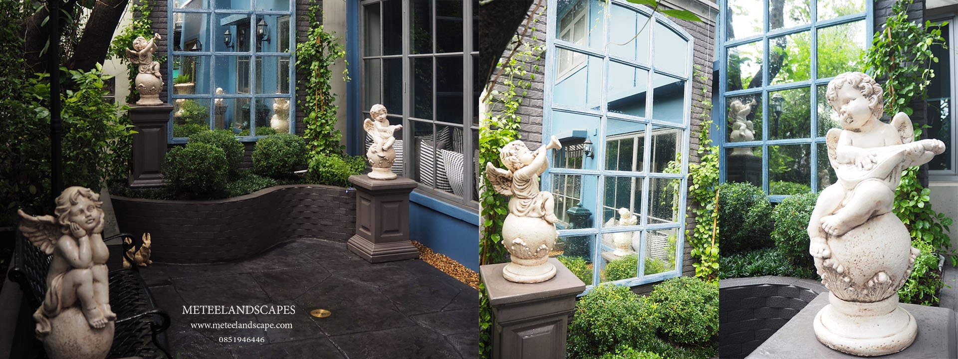 โจทย์ข้อที่ 2 คือ อารมณ์ของสวน บรรยากาศแห่งความมีมงคลในสวน มีเทวดาในสวน ผมจึงได้เลือกใช้ปะติมากรรม CUPID ซึ่งเป็นสัญลักษณ์ เทพเจ้าแห่งความรักของชาวโรมัน ซึ่งผมได้พยายามเลือกตัวที่มีเครื่องเล่นดนตรี เพื่อสร้างบรรยากาศให้สวนนี้นอกจากมีเรื่องราวของความเป็นมงคลแล้วรูปทรงเล่นดนตรีก็ทำให้สวนแห่งนี้มีเสียงได้นะครับ เมื่อเราได้รูปทรงของ cupid เรียบร้อยแล้วสิ่งที่เพิ่มเติมมาคือ การทำสีของปะติมากรรมให้ดูถึงความนุ่มนวลขึ้น เพราะสวนแห่งนี้ผมเน้นความหรูหรามีรสนิยม ดังนั้นจึงไม่ได้เลือกใช้แนวสีปูนดิบ ผมได้ทำการย้อมสีให้เป็นแนววินเทจเป็นสีงาช้างซึ่งทำให้สวนดูนุ่มขึ้น สว่างขึ้น สร้างบรรยากาศที่ผ่อนคลายมากขึ้นครับ