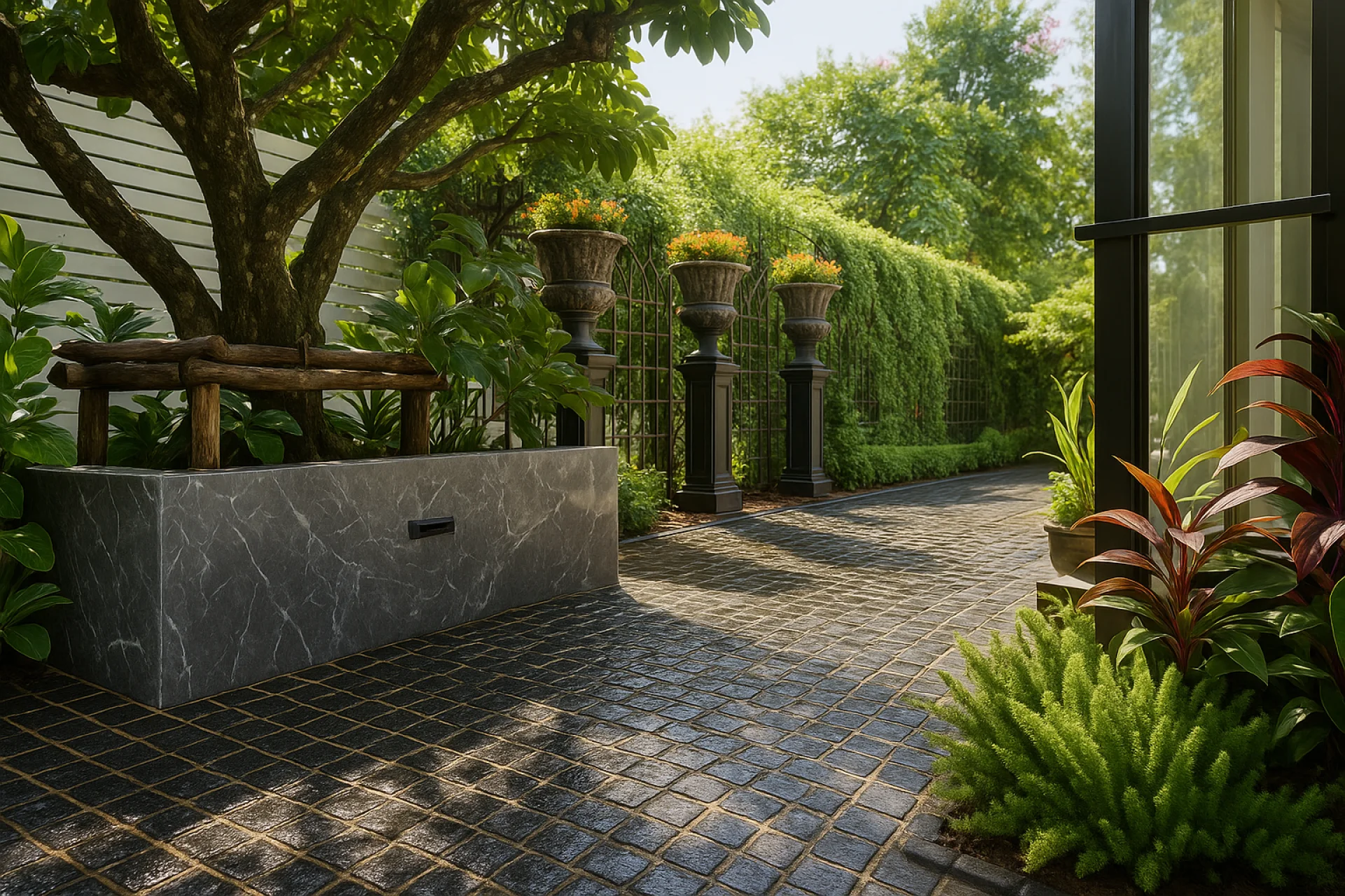 จากหิน Cobblestone สีเข้ม ที่สะท้อนแสงแดดเบา ๆ ยามเช้า